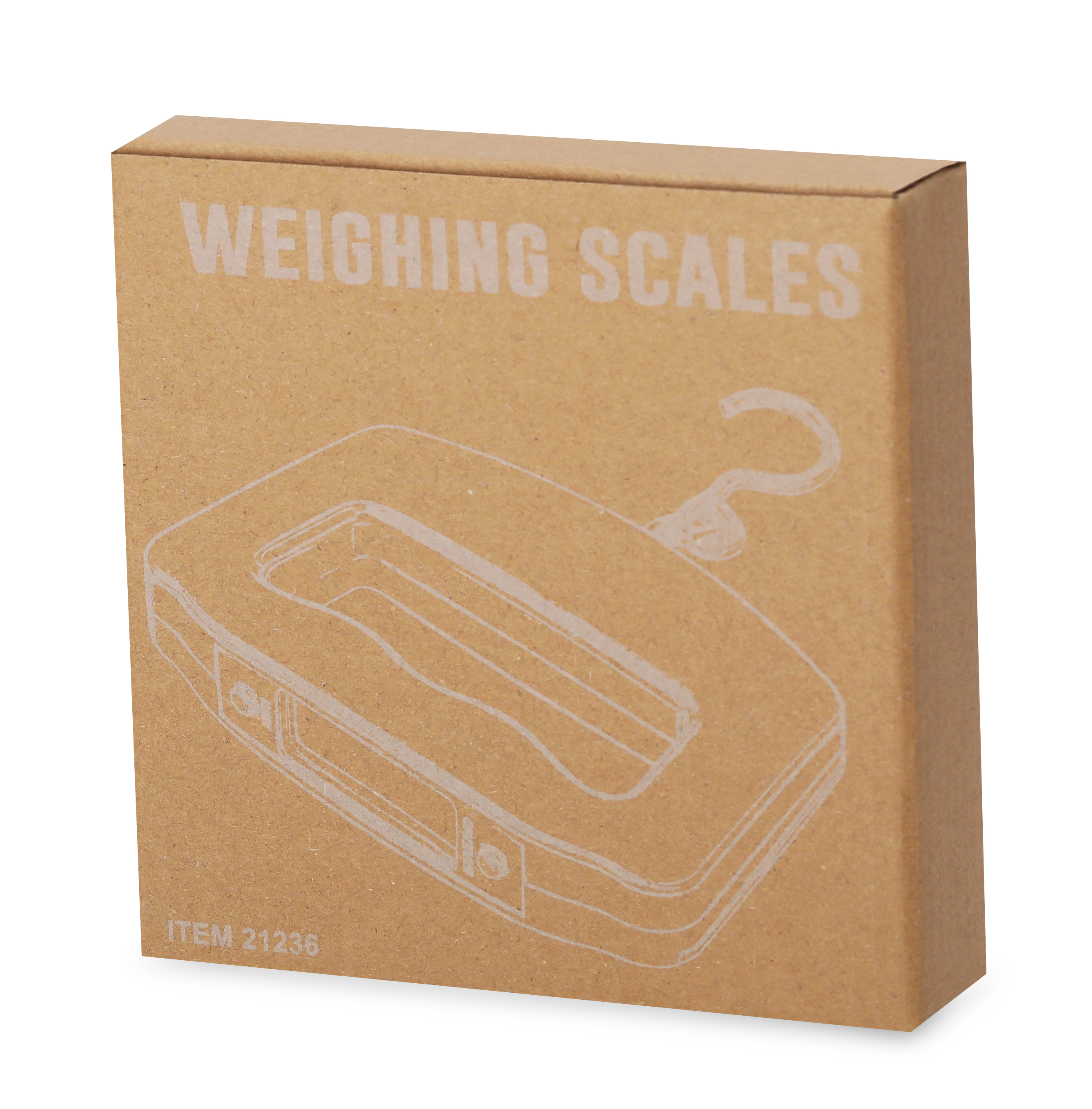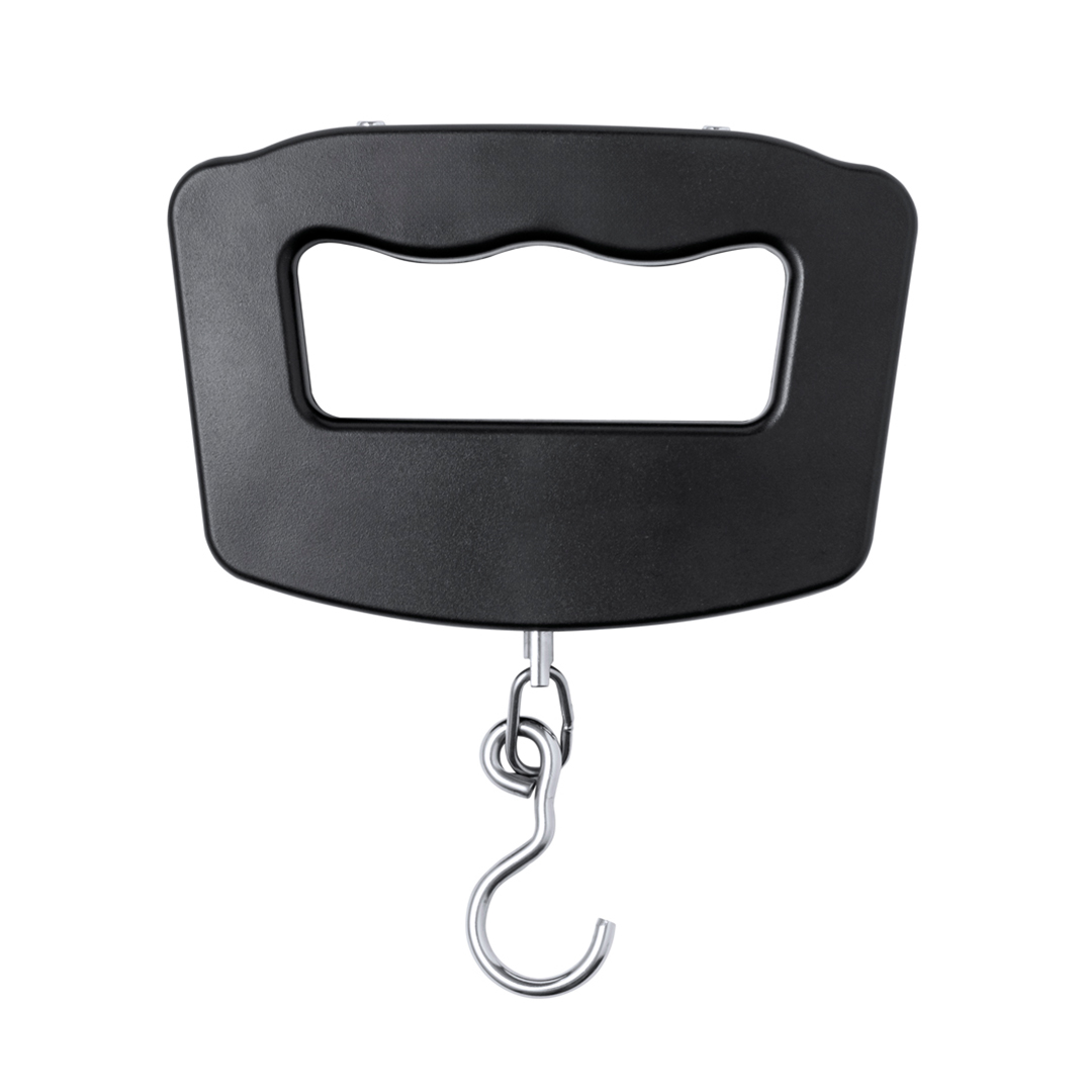 Báscula digital de mano portátil. De diseño ergonómico para adaptarse a la mano y facilitar la visualización de su pantalla LCD. Con botón ON/OFF, función TARA, y varias unidades de medida: gramos (g), kilogramos (kg), libras (lb) y onzas (oz). Con gancho metálico para facilitar el pesaje de diversos objetos y un peso máximo de 50kg. Incluye instrucciones en español e inglés y está alimentada por 2 pilas AAA (no incluidas). Presentada individualmente en caja de diseño kraft.