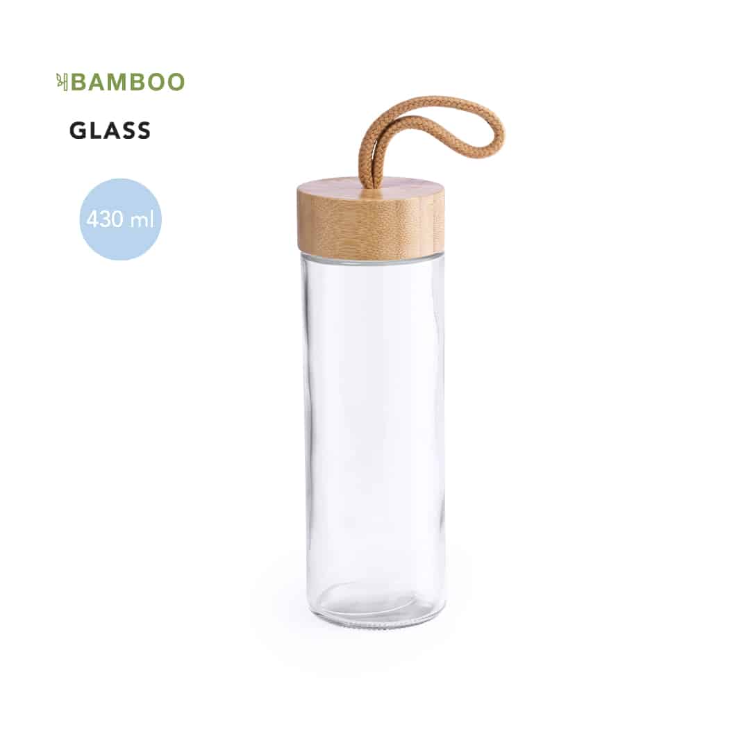 Tarro de línea nature de 420ml de capacidad. Fabricado con cuerpo de cristal y tapón a rosca de bambú, con práctica asa de transporte trenzada en color natural. Presentado en caja individual de atractivo diseño.