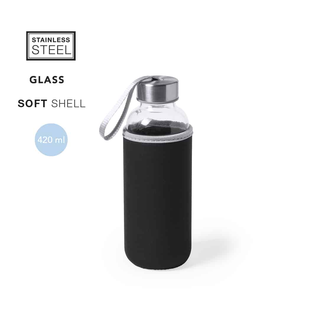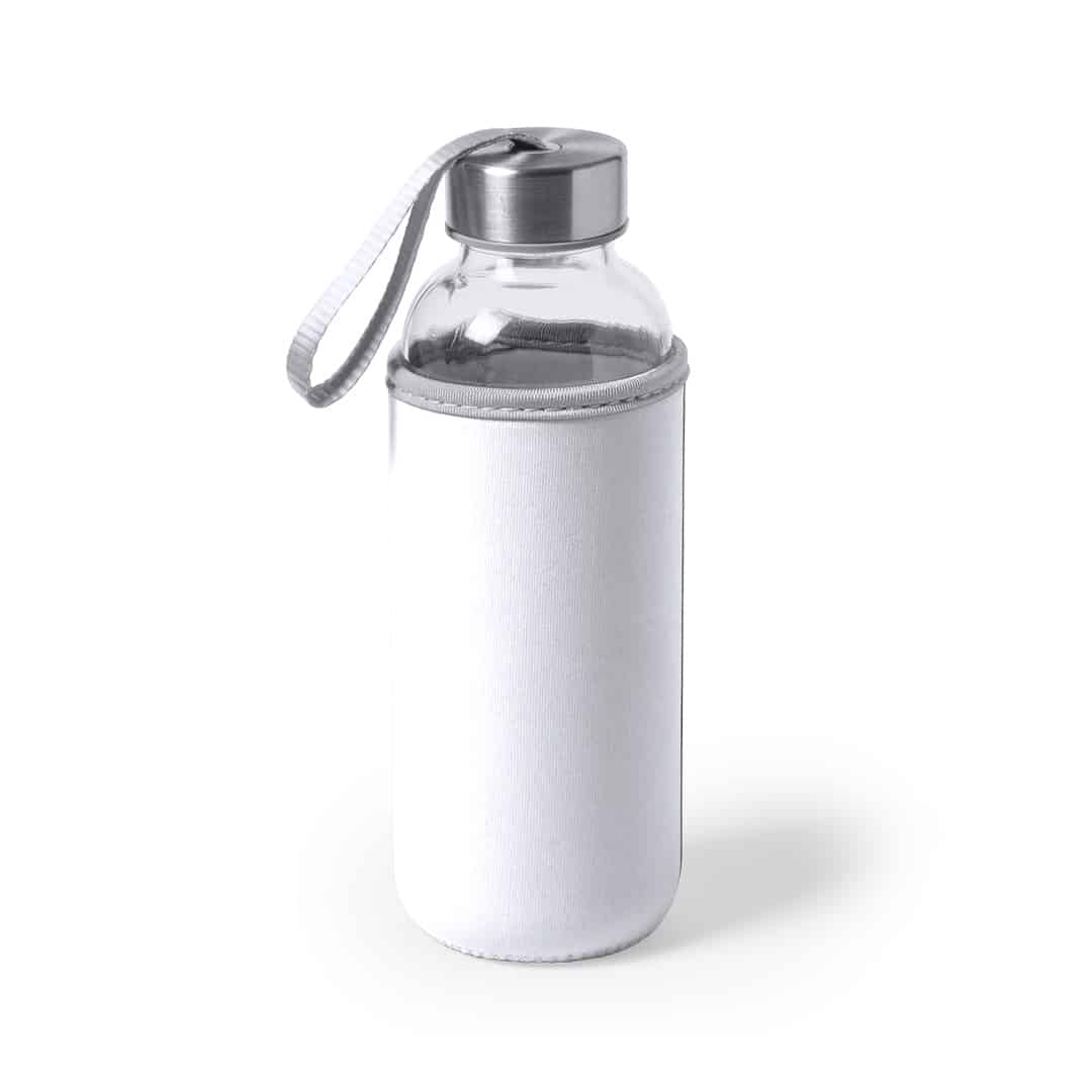 Bidón de cristal de 420 ml de capacidad. Con tapón de seguridad a rosca y practica cinta de transporte, cuenta con una elegante funda de neopreno en vivos colores. Presentado individualmente en una caja de diseño.