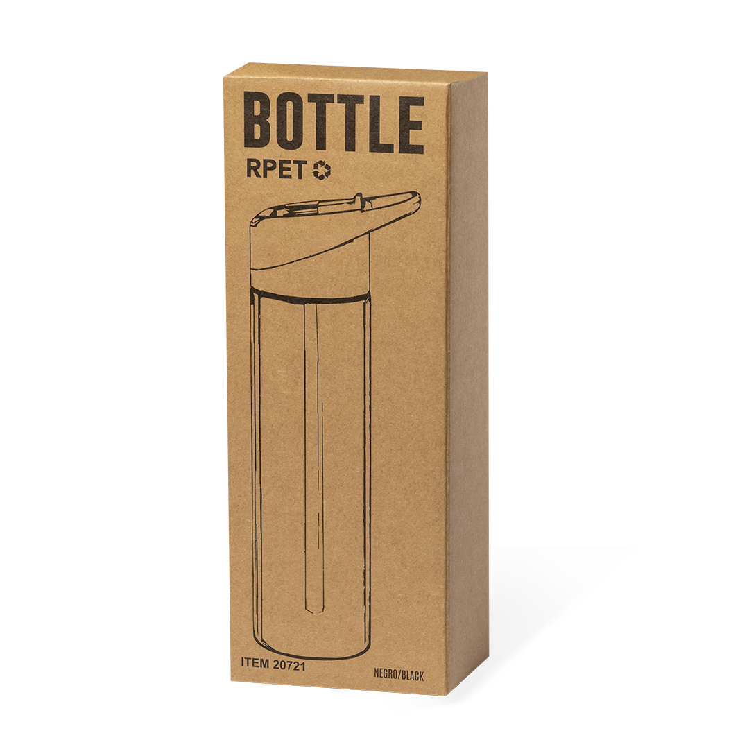 Bidón en RPET de 600 ml de capacidad. Libre de BPA, con sistema de fácil apertura, dosificador con pajita incluida y asa de transporte a juego. Disponible en variada gama de colores brillantes y presentado en atractiva caja de diseño kraft.El material RPET se elabora a partir de plástico reciclado, para así fomentar la reutilización de residuos plásticos y ayudar a la sostenibilidad del planeta.