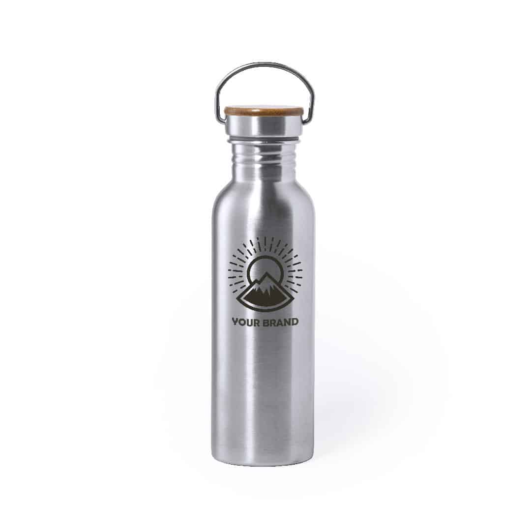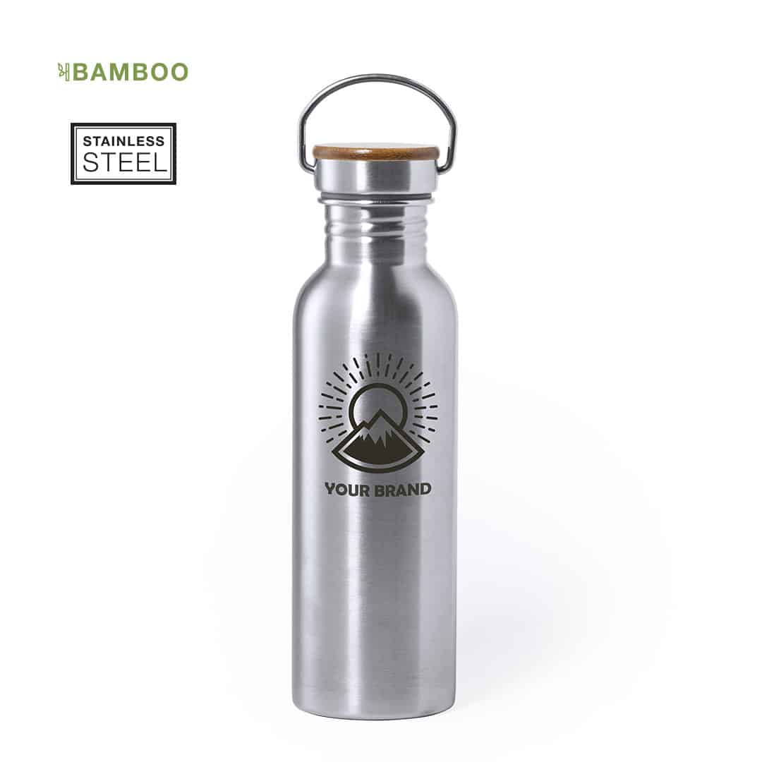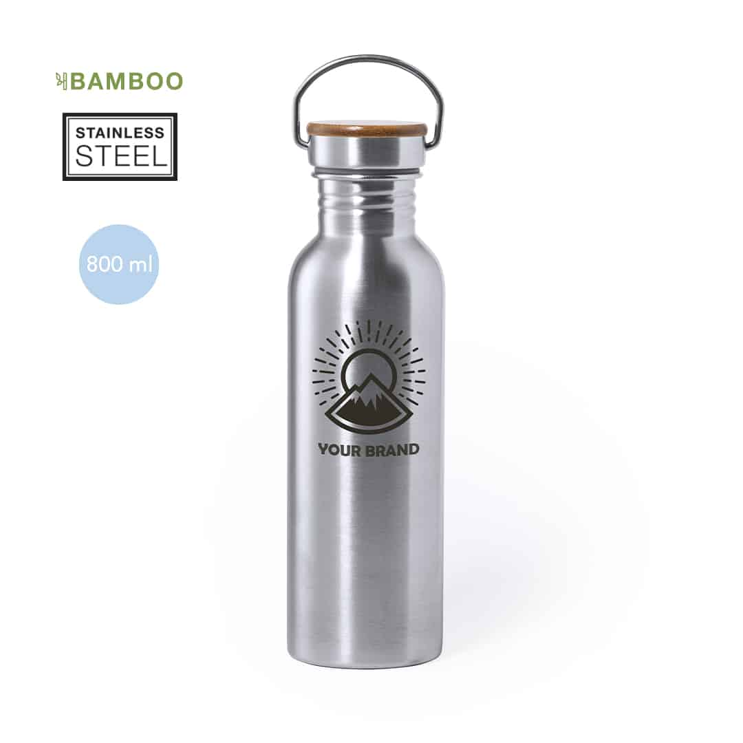 Bidón de línea nature y 800ml de capacidad. Cuerpo fabricado en acero inox y tapón en bambú con original asa metálica de transporte. Presentado en atractiva caja de diseño eco.