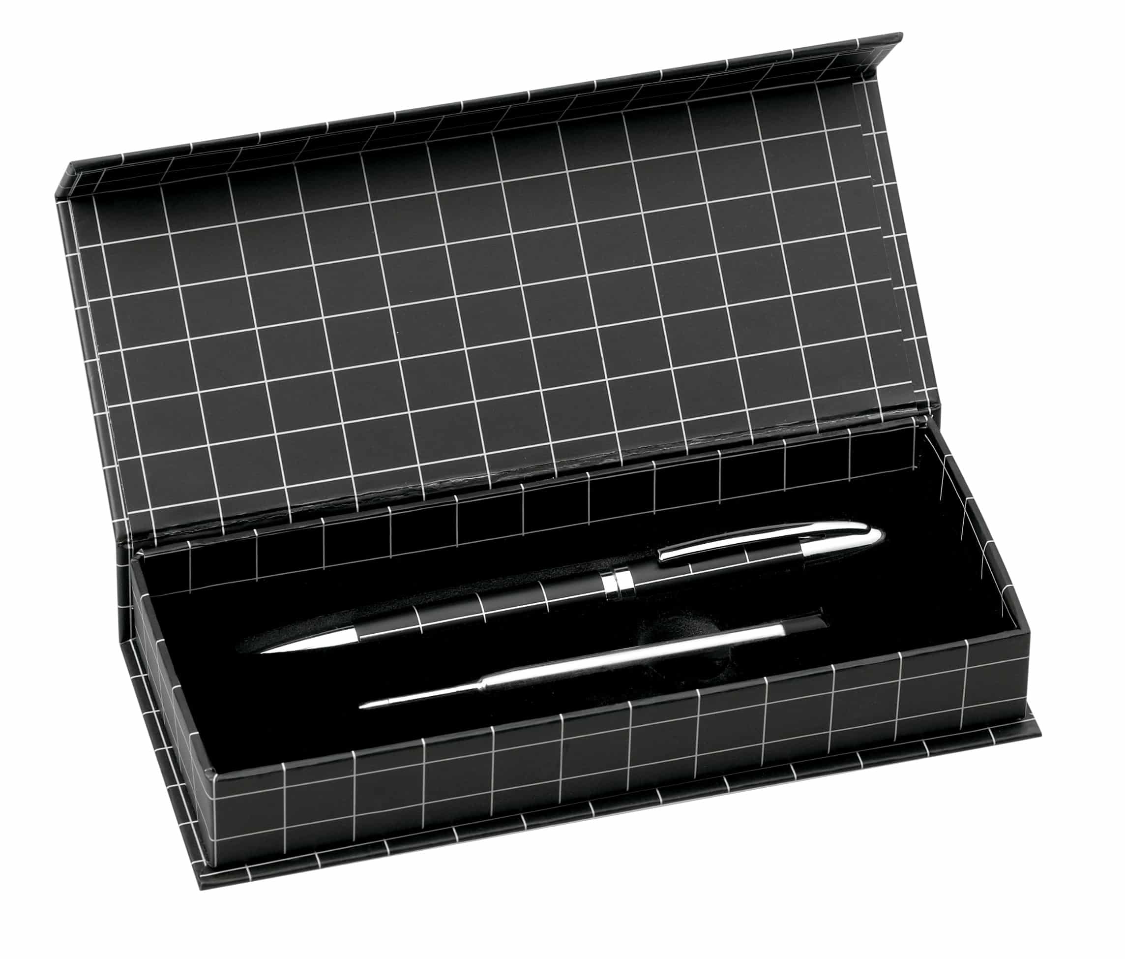 Elegante bolígrafo de mecanismo giratorio en sobrio diseño bicolor. De cuerpo metálico en suave acabado con accesorios en colores plateados. Presentado en elegante estuche individual en color negro con cierre de imán. De cartucho jumbo, con recambio incluido y en tinta azul.