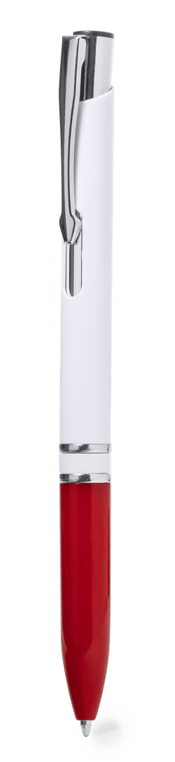 Elegante bolígrafo con mecanismo pulsador. Con cuerpo acabado en color blanco brillo y empuñadura en variada gama colores. Fabricado en resistente ABS acabado brillo. Con carga jumbo y tinta azul.