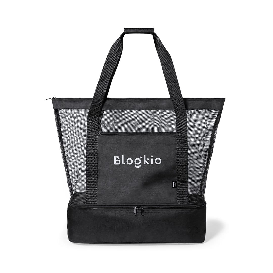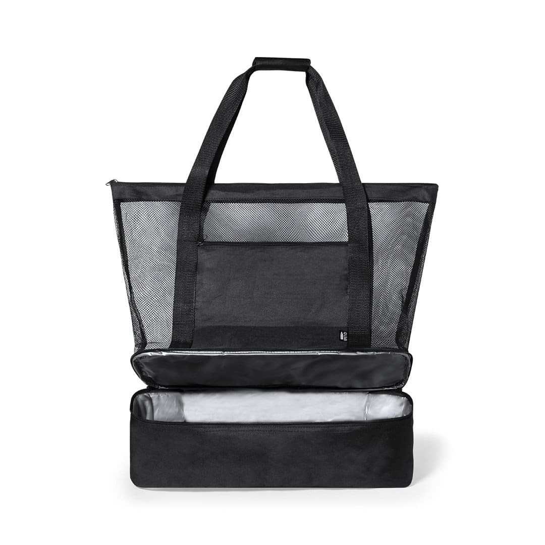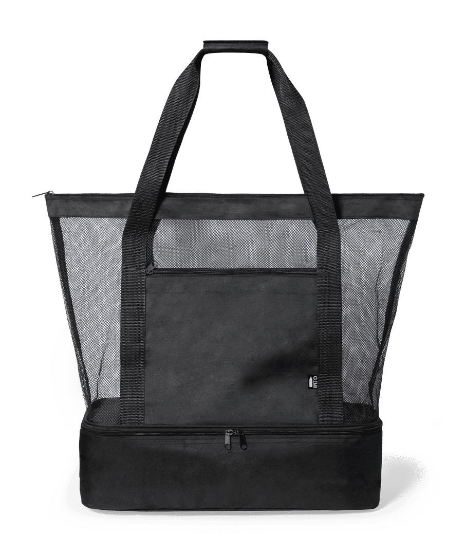 Bolsa nevera en resistente poliéster RPET 600D elaborado a partir de plástico reciclado para así fomentar la reutilización de residuos plásticos y contribuir a la sostenibilidad del planeta. Compartimento principal en redecilla tipo mesh, con cierre de cremallera. Nevera integrada en base, en resistente poliéster 600D RPET, con interior isotermo en PEVA. Asas de transporte reforzadas y amplio bolsillo frontal, con distintivo RPET en etiqueta.