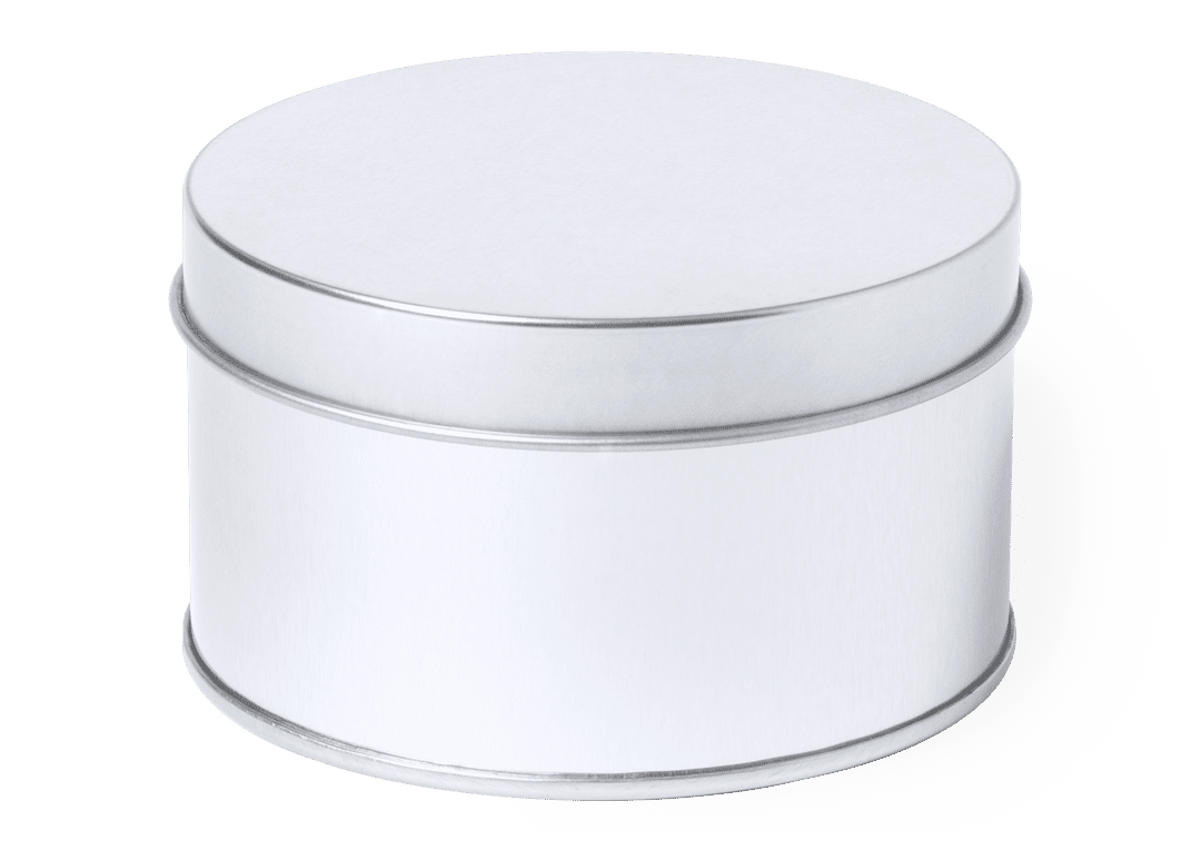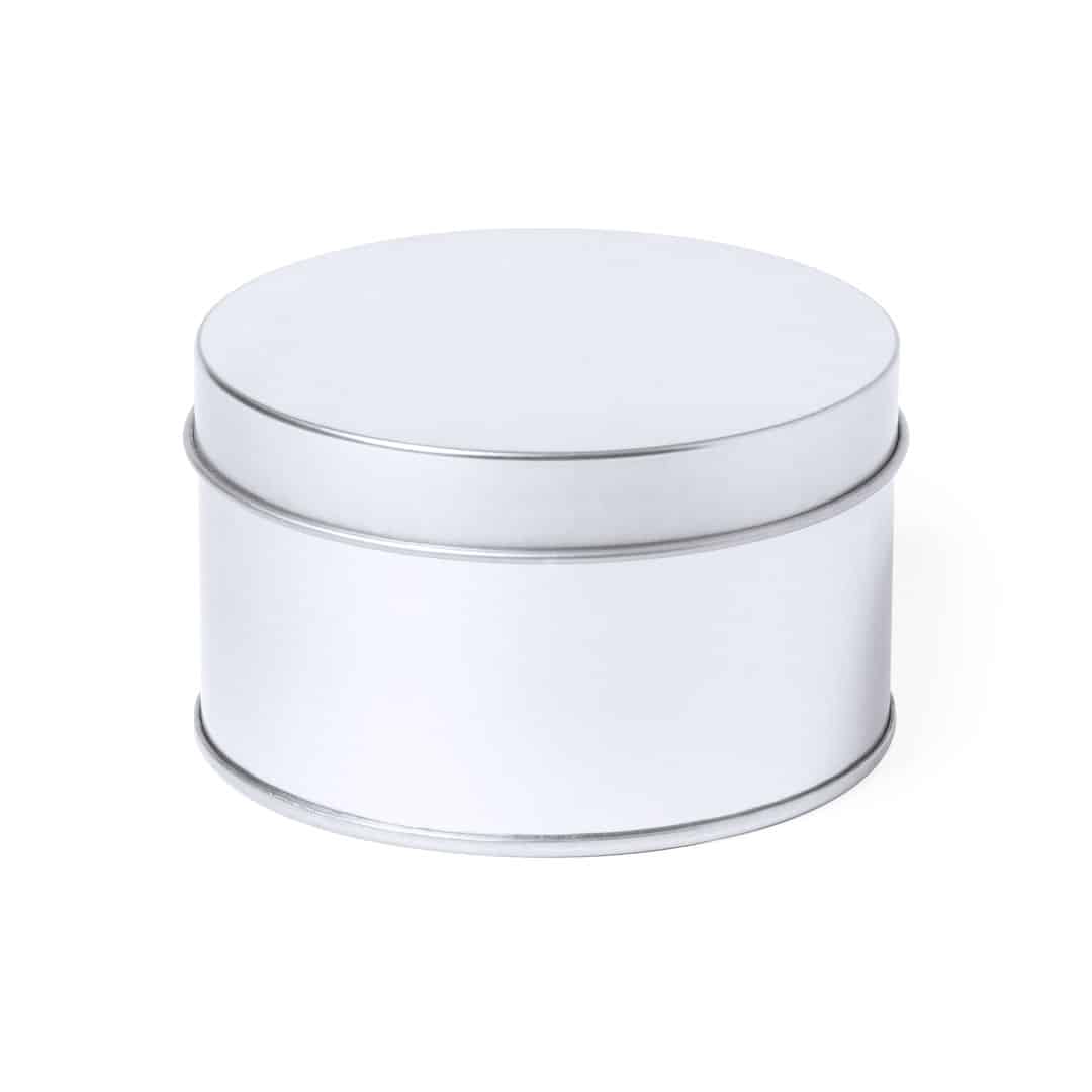 Caja de presentación formato redondo, fabricada en resistente metal de acabado plateado y con tapa a juego.