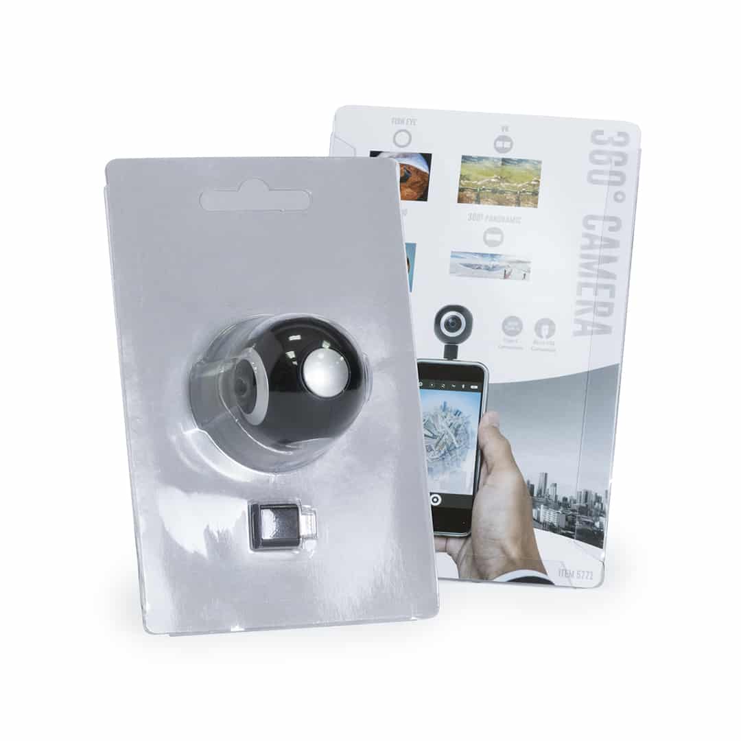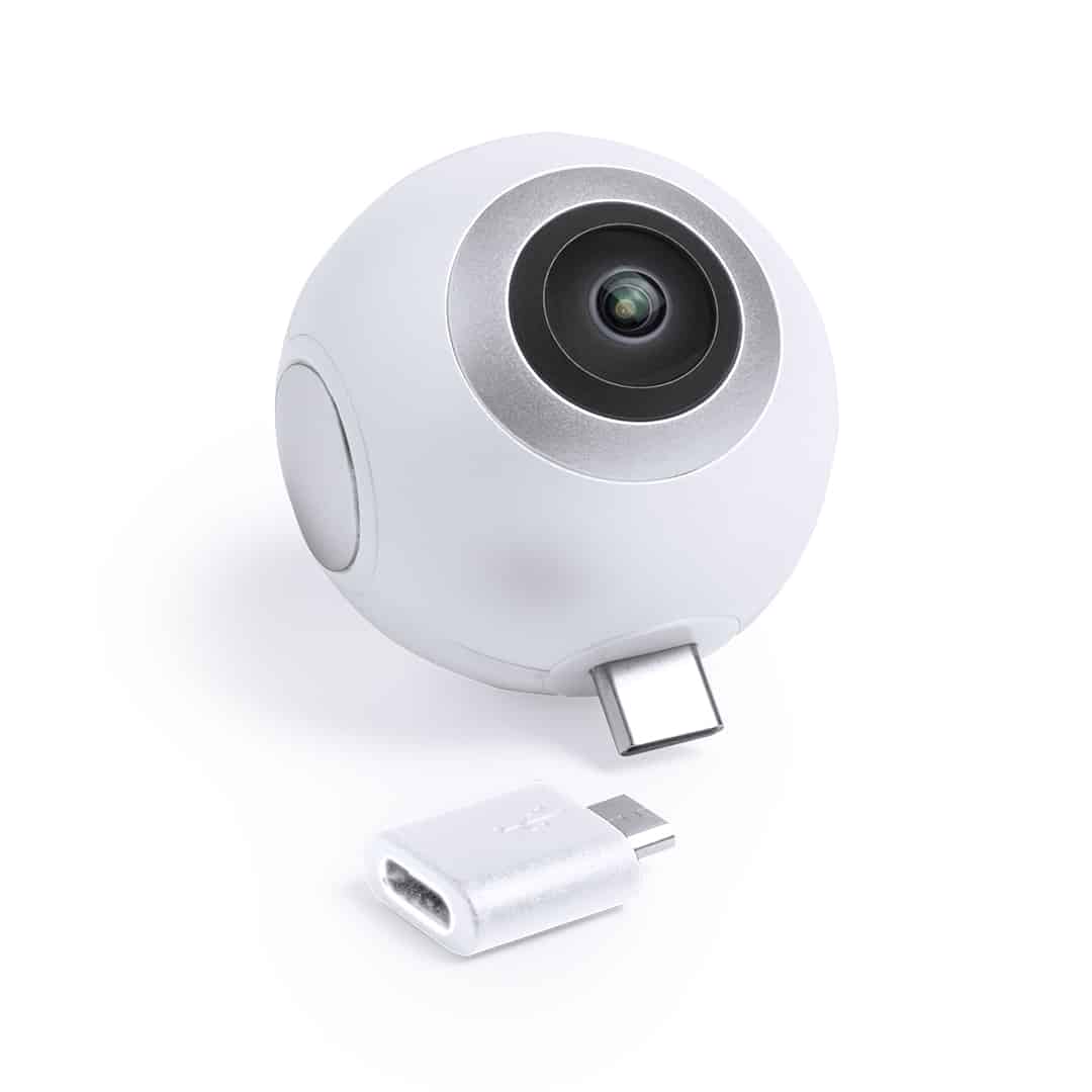 Cámara 360° con conexión Tipo-C y adaptador micro USB para dispositivos móviles Android. De alta calidad de captura de vídeo 360° con resolución HD 2048x1024p, especialmente diseñada para uso intensivo. APP disponible para disfrutar de los vídeos filmados en 360° en gafas de realidad virtual compatibles -no incluidas-. Presentada en atractiva caja de diseño.