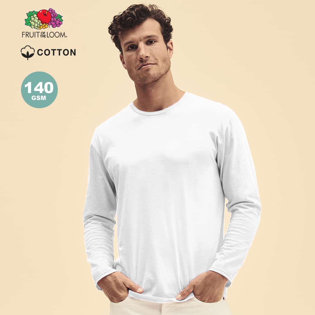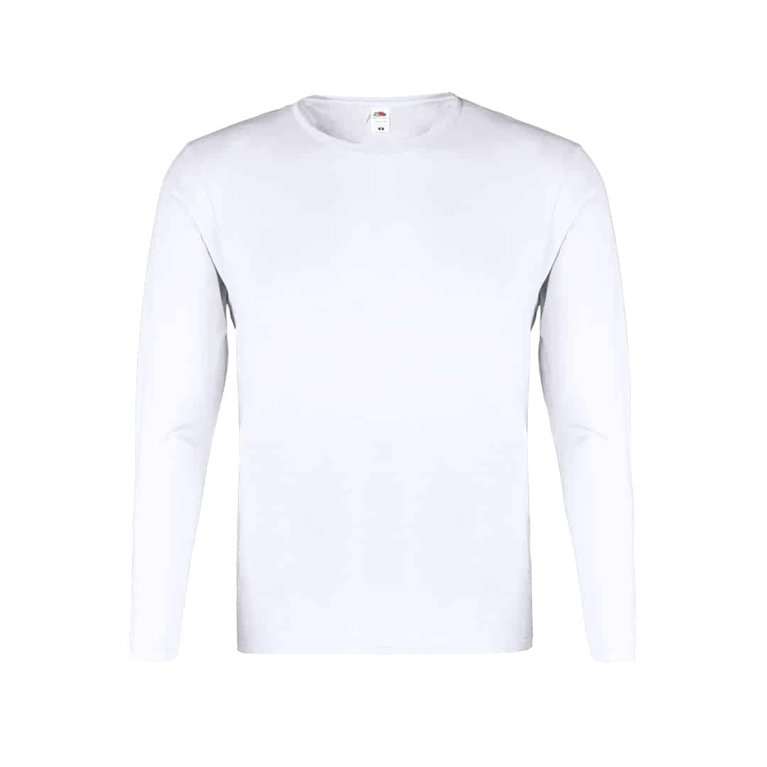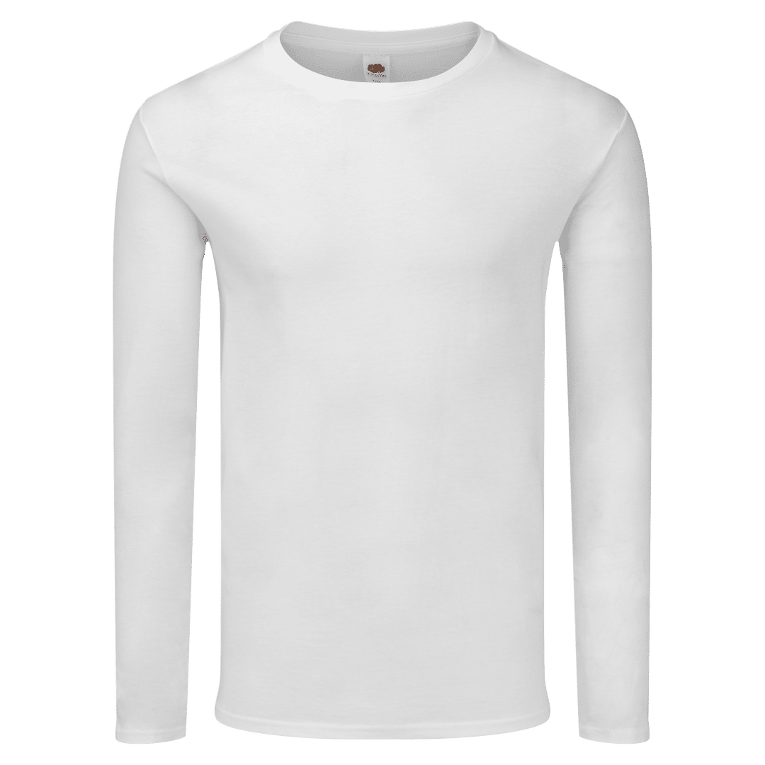Camiseta adulto blanca Iconic Long Sleeve de Fruit Of The Loom. Manga larga, fabricada en material 100% algodón peinado Ring Spun de 140g/m2. De tacto suave y corte clásico, con cuello redondo estrecho de canalé 1×1 y tapeta a juego. Etiqueta fácilmente removible y disponible en tallas S, M, L, XL, XXL.