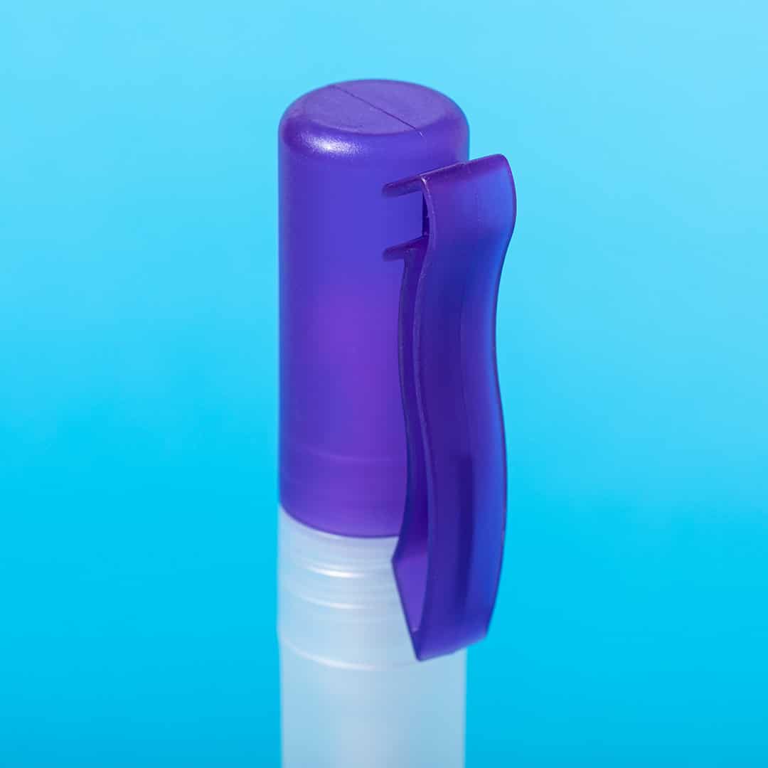 Spray hidroalcohólico para higiene y limpieza de la piel en bote rellenable de 10 ml. Cuerpo en translúcido y capucha disponible en variada gama de colores, con clip de ajuste. Solución con 65% de contenido de alcohol.Artículo con certificación GMP (Good Manufaturing Practices / Normas de Correcta Fabricación) que garantiza el cumplimiento de rigurosas medidas de control para la obtención de un producto seguro y de calidad.