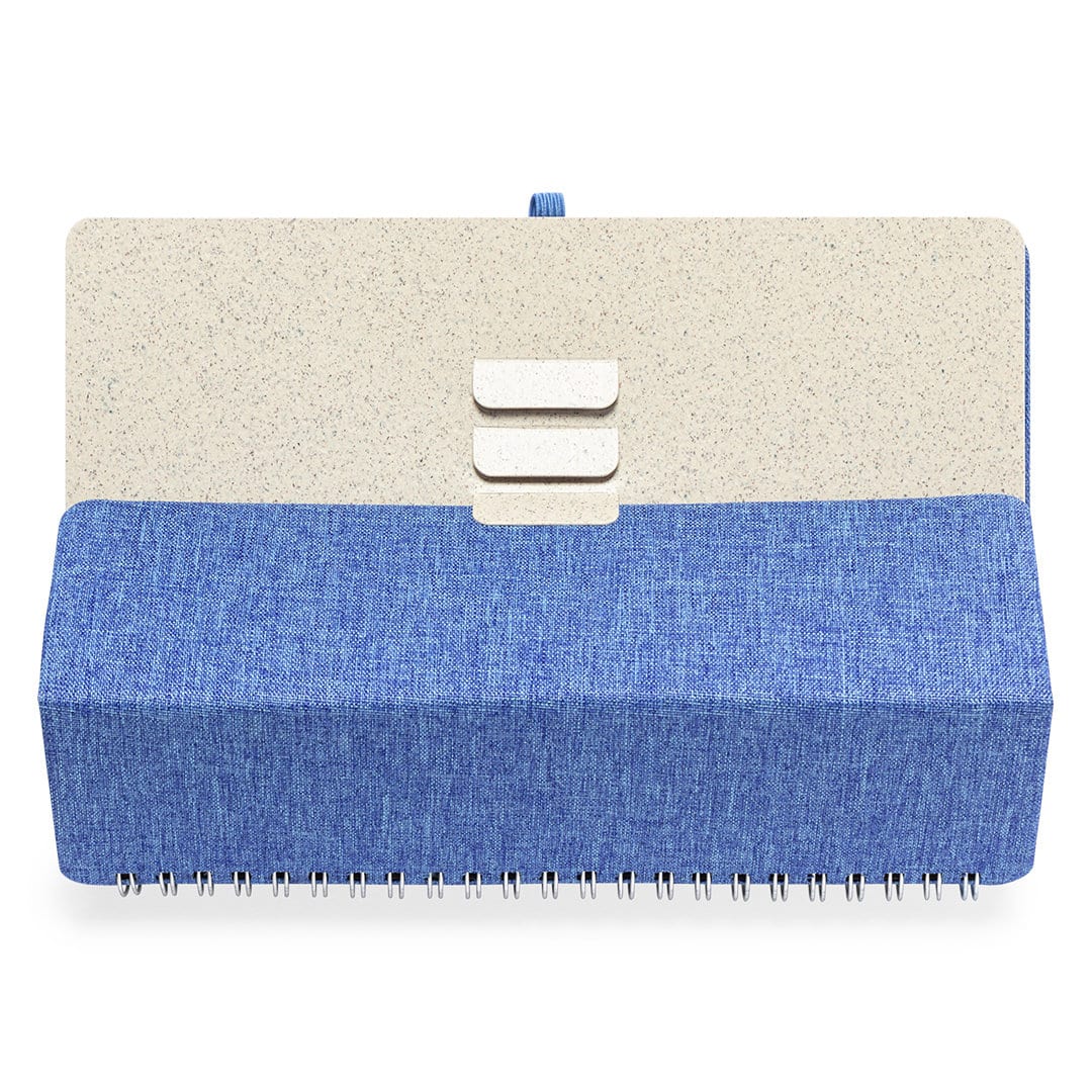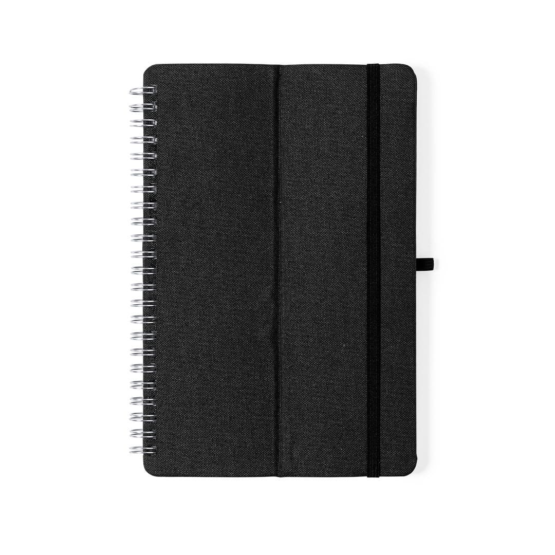 Libreta soporte de anillas de línea nature. Tapas rígidas fabricadas en resistente material RPET 300D, elaborado a partir de plástico reciclado. Con original soporte para smartphone y tablet integrado en la portada y fabricado en caña de trigo. Incluye elástico de cierre y soporte para bolígrafo a juego. 70 hojas interiores con disposición a una raya y disponible en variada gama de colores. Con distintivo RPET en contraportada y presentada en bolsa individual reciclada.