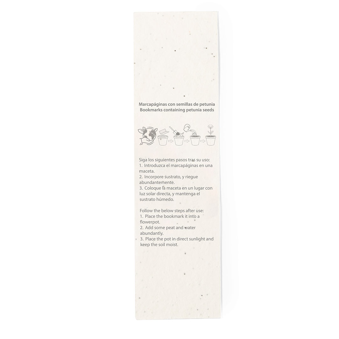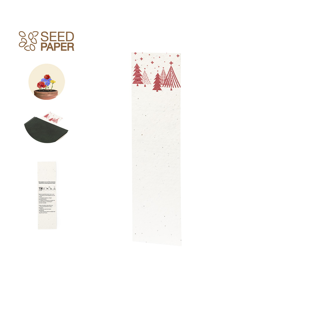 Marcapáginas de diseño navideño fabricado en papel de semillas. El papel incluye semillas de petunia, convirtiéndolo en papel plantable al final de su vida útil. Incluye instrucciones de plantado en la cubierta trasera y amplia superficie de marcaje.