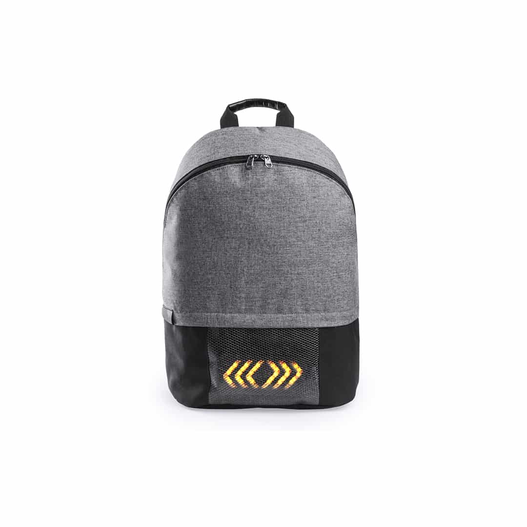 Mochila con indicadores, en resistente poliéster 600D. Indicadores luminosos en la base, con señalización controlada desde las cintas de hombros de la mochila. Bolsillo principal con doble tirador e interior con bolsillo acolchado para ordenador portátil de hasta 15 pulgadas. Espalda y cintas acolchadas. Conexión micro USB -cable incluido-. Requiere de un powerbank -no incluido- para el funcionamiento de las luces.