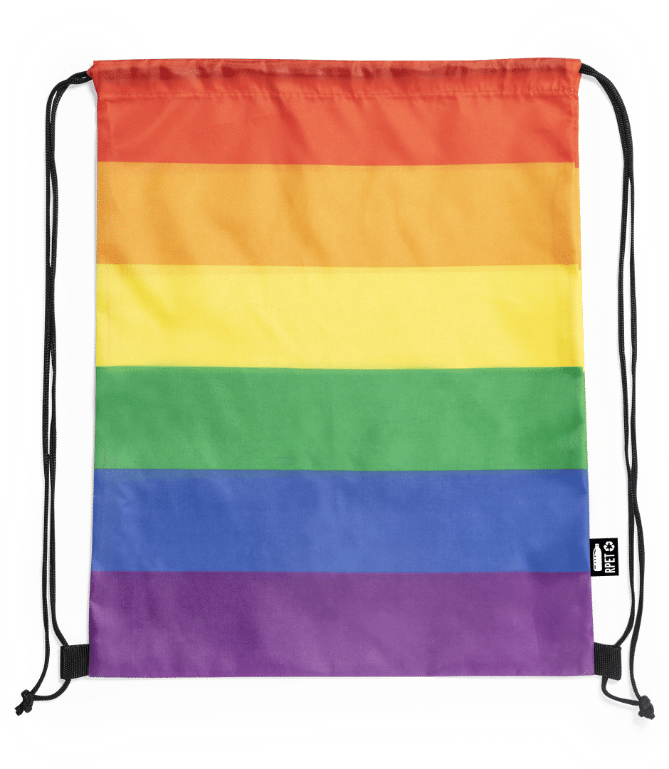 Mochila de cuerdas Rainbow multicolor, fabricada en RPET 210T. De acabado cosido y con cordones de cierre premium en negro. Todo un orgullo de mochila, con distintivo RPET en etiqueta exterior.El material RPET se elabora a partir de plástico reciclado, para así fomentar la reutilización de residuos plásticos y ayudar a la sostenibilidad del planeta.