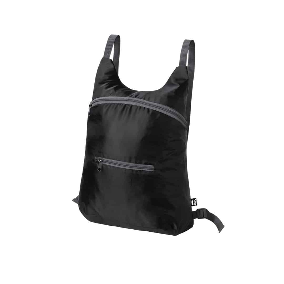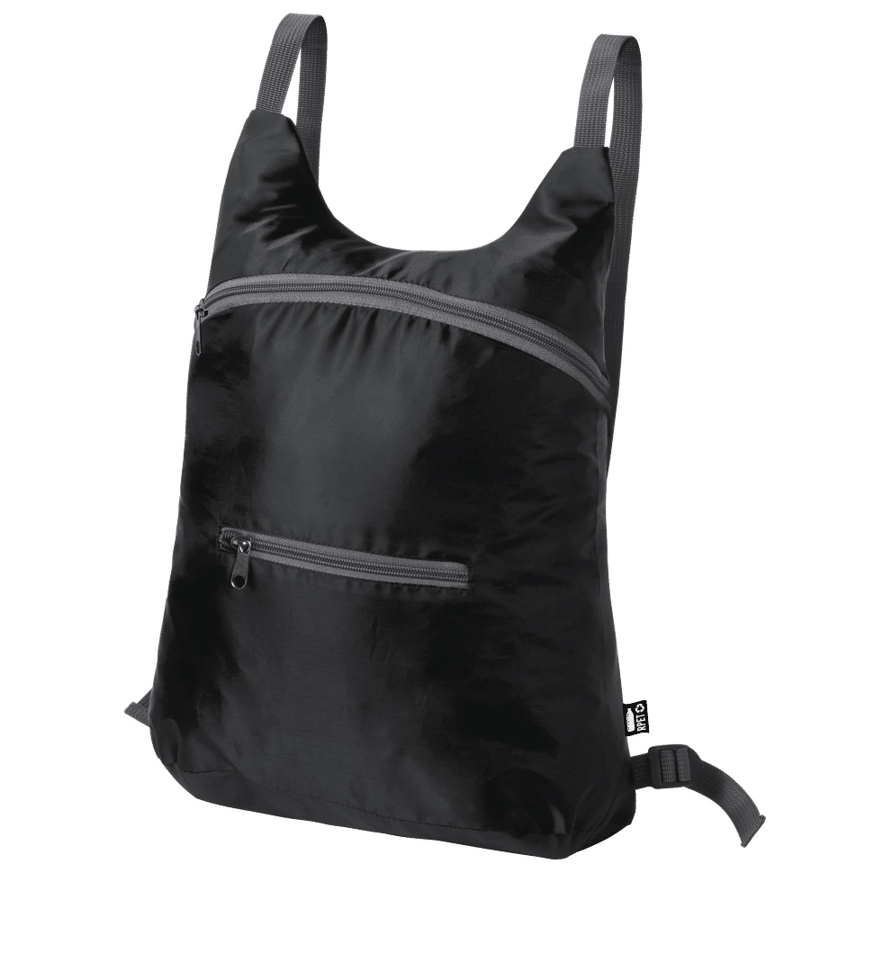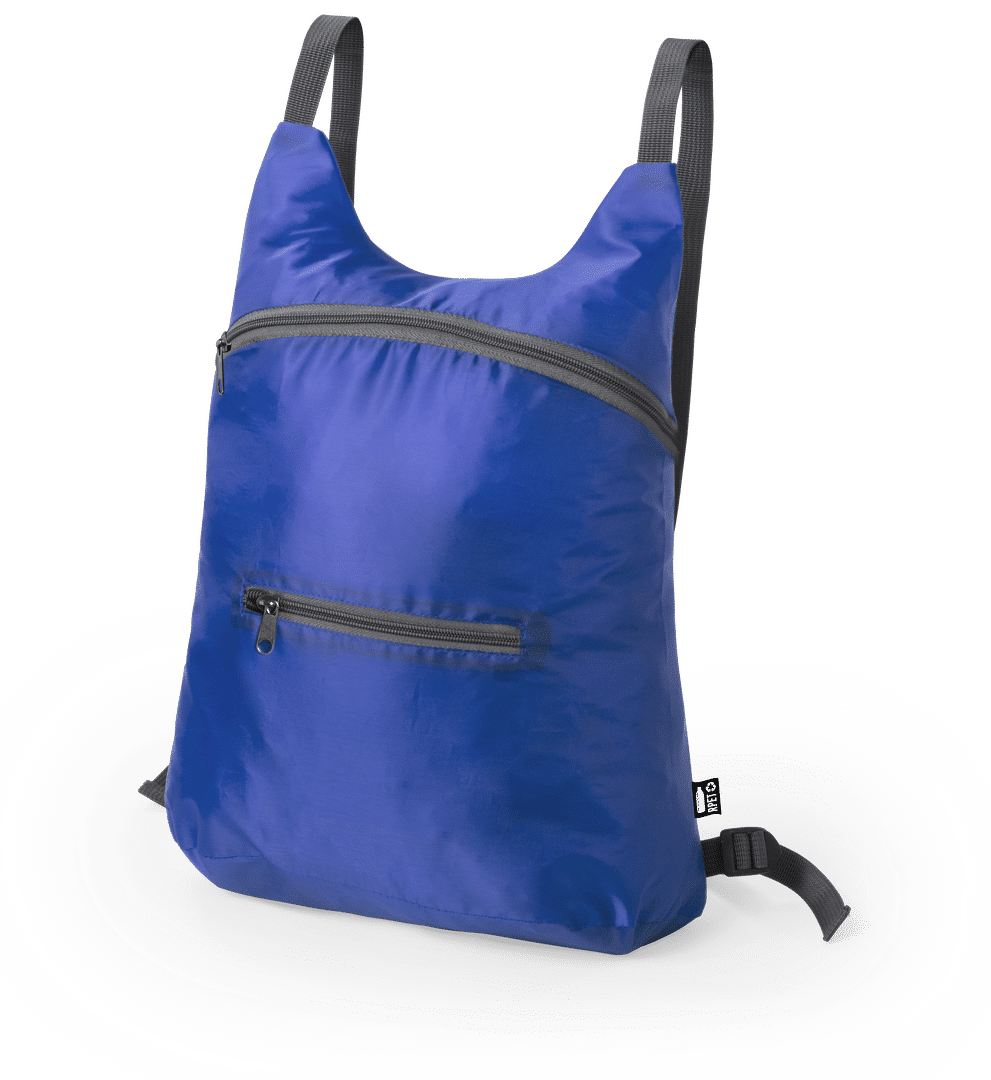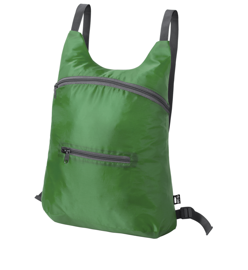 Mochila plegable en suave poliéster 201D RPET, elaborado a partir de plástico reciclado, para así fomentar la reutilización de residuos plásticos y ayudar a la sostenibilidad del planeta. Con cierre de cremallera y bolsillo frontal. Esquinas reforzadas, cintas de hombros regulables y accesorios en color gris. Plegado de pequeño tamaño, con cinta de transporte y disponible en variada gama de colores. Distintivo RPET en etiqueta.