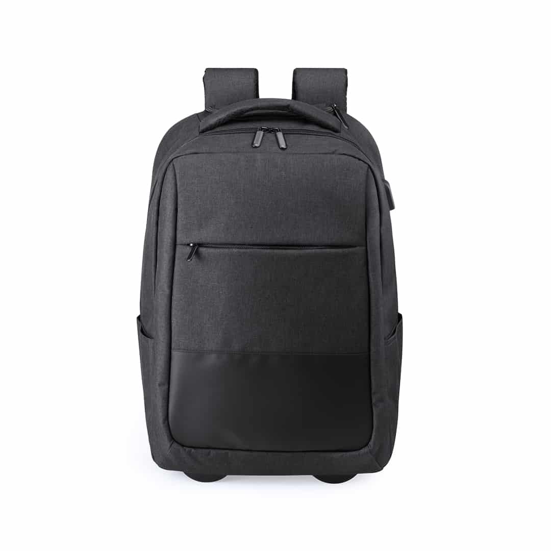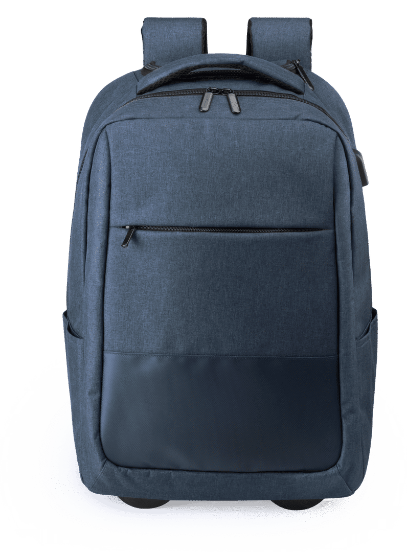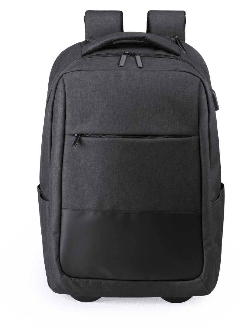 Mochila trolley en resistente poliéster 300D. Con conexión USB -powerbank no incuido- y bolsillo interior acolchado para ordenador portátil de hasta 15 pulgadas y compartimento para tablet de hasta 10 pulgadas. Bolsillo principal con doble tirador, bolsillos lateral y frontal. Compartimento para mecanismo de trolley con cierre de cremallera, asa reforzada y accesorio cubre ruedas con fijación de velcro. Espalda acolchada y cintas de hombros ajustables con acolchado.