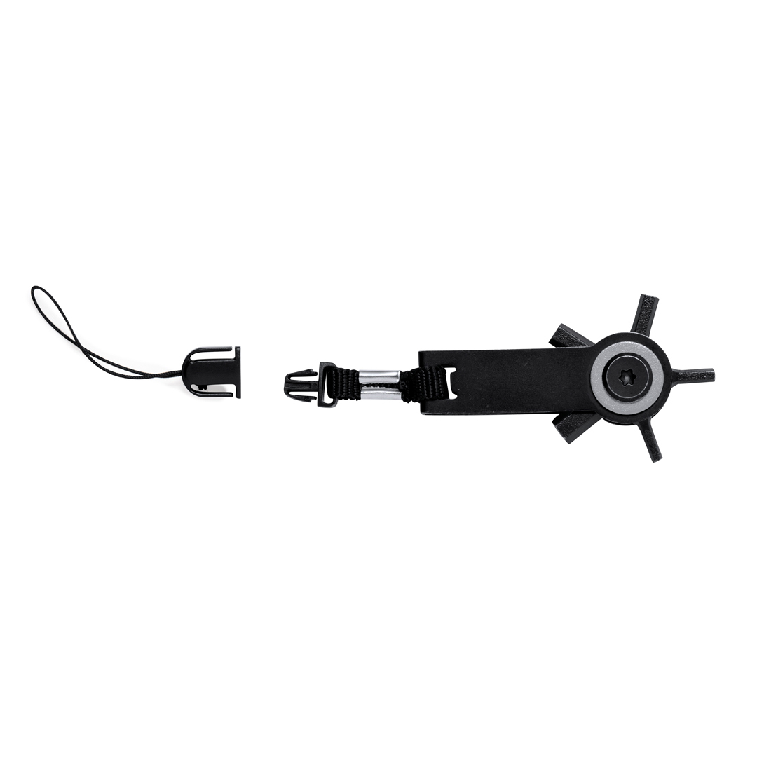 Eficaz multiherramienta con cabezal giratorio fabricada en acero inox y acabado en negro. Con 10 funciones: llaves allen, llave para tuercas hexagonales en varios tamaños, regla y un práctico accesorio de transporte con cierre de hebilla. Presentado en bolsa de papel reciclada de diseño kraft.