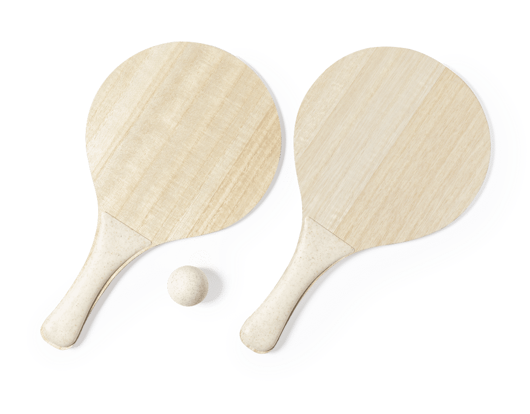 Par de palas de playa con tableros integrados de ajedrez, damas y parchís. Fabricadas en madera, con mango recubierto en caña de trigo y pelota también en caña de trigo. Incluye figuras de ajedrez, fichas de damas, fichas de parchís y dados. Set presentado en mochila individual 100% algodón con cuerdas de cierre a juego.La caña de trigo fomenta la utilización de materias primas naturales, reduciendo así las emisiones contaminantes.
