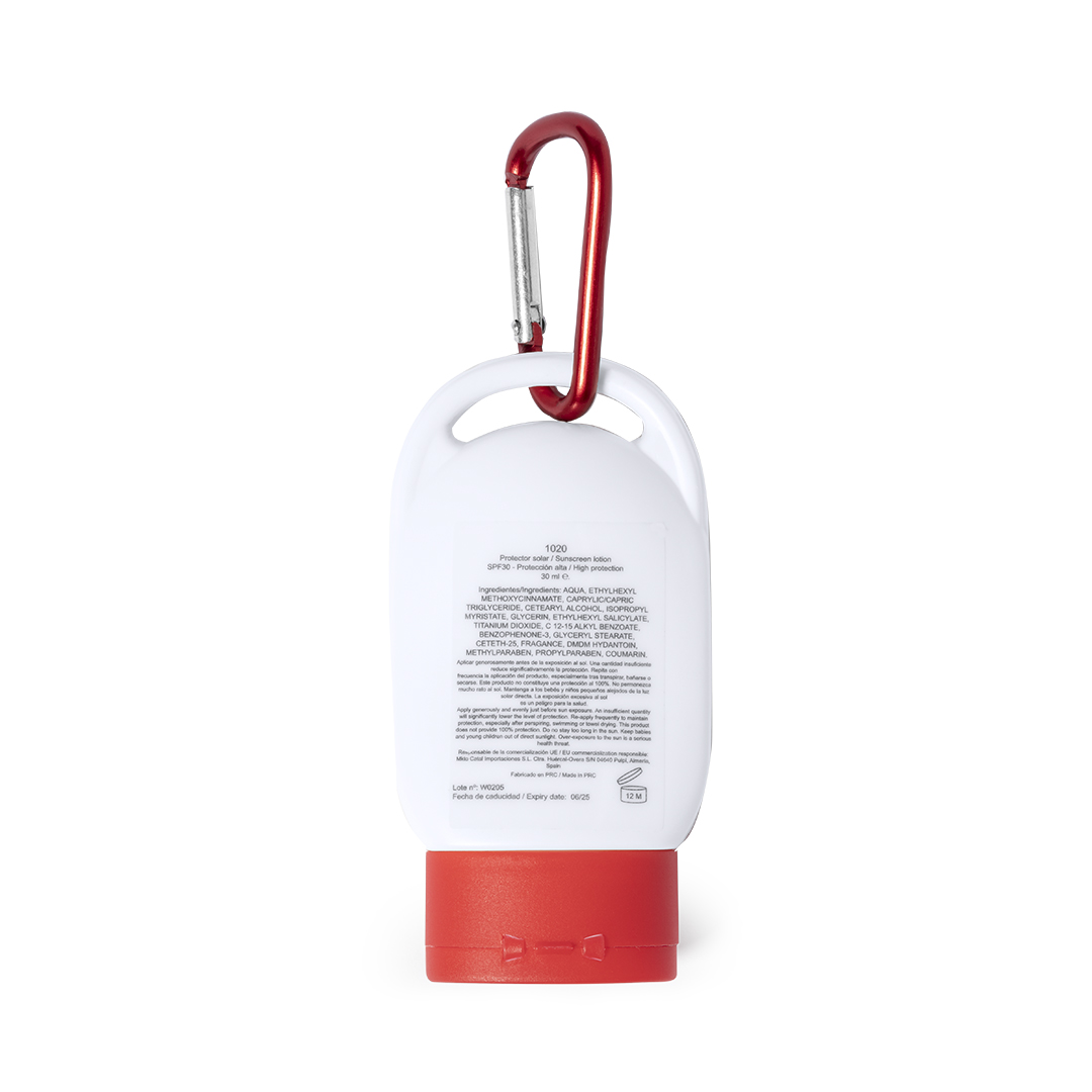 Crema de protección solar factor 30. Presentada en práctico bote de 30ml y acabado frosted. Disponible en variada gama de colores, con mosquetón de transporte a juego.