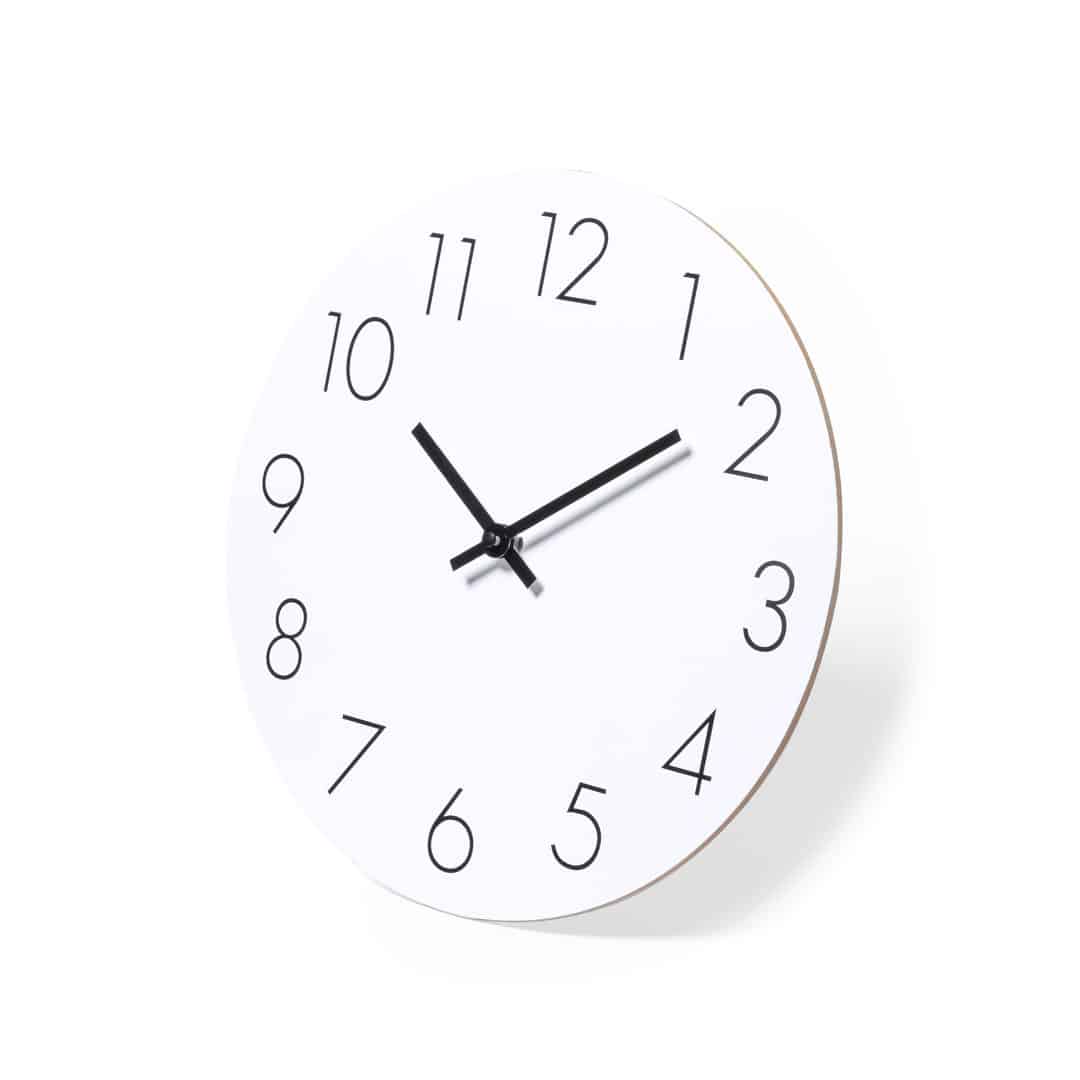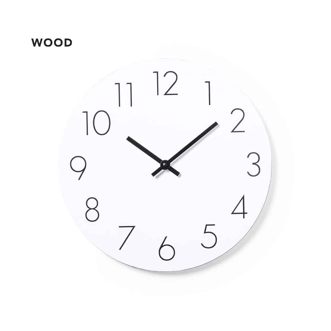 Reloj de pared fabricado en madera MDF y dial en blanco. Presentado en caja individual de diseño kraft. Alimentación a pilas (1xAA no incluida).