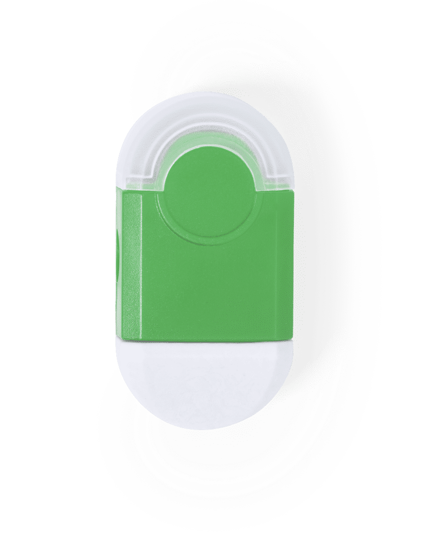 Set de goma y sacapuntas en vivos colores. Compartimento para residuos con capucha transparente.