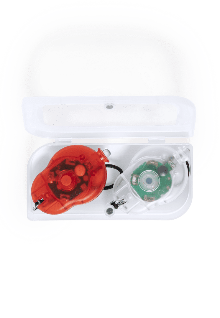 Set de luces de seguridad led para bici. Incluye 2 piezas, con dos posiciones de luz y presentadas en resistente estuche individual con cierre magnético. Alimentación a pilas de botón (incluidas).
