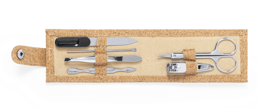 Set de manicura de línea nature con funda fabricada en corcho, para así fomentar la utilización de materias primas naturales y reducir las emisiones contaminantes. Incluye 6 accesorios de acero inox: tijeras, pinzas, cortaúñas, lima y 2 quitacutículas. Soportes interiores para accesorios y cierre de corchete. Totalmente desplegable para fácil marcaje.