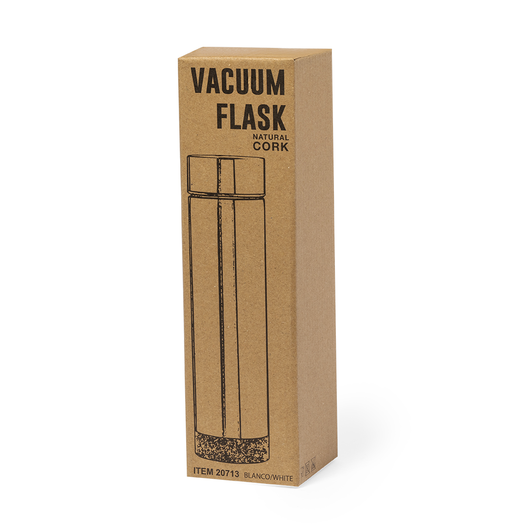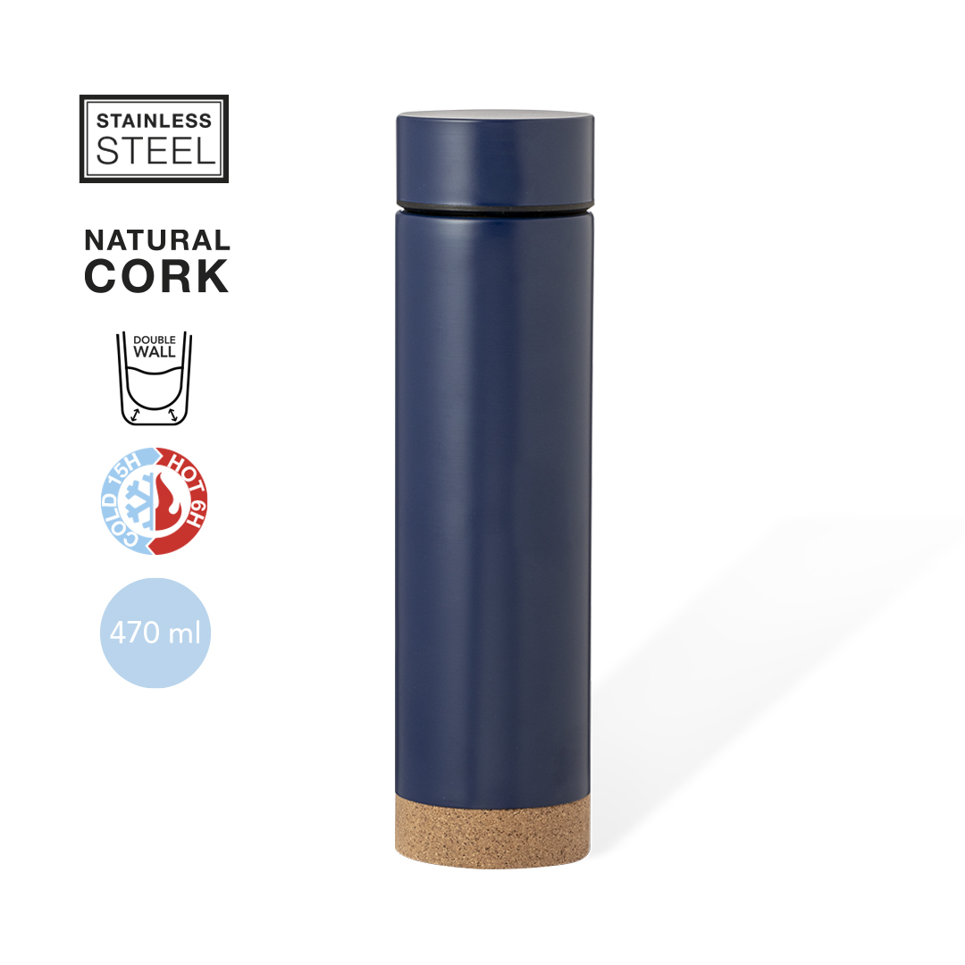 Termo en acero inox de 470 ml de capacidad con base de corcho. Con doble pared para mejor y más duradera conservación de la temperatura. Infusor incluido y sistema de apertura fácil a rosca. Disponible en variada gama de colores y presentado en atractiva caja de diseño kraft.Elaborado con elementos vegetales para así fomentar la utilización de materias primas naturales y reducir las emisiones contaminantes.