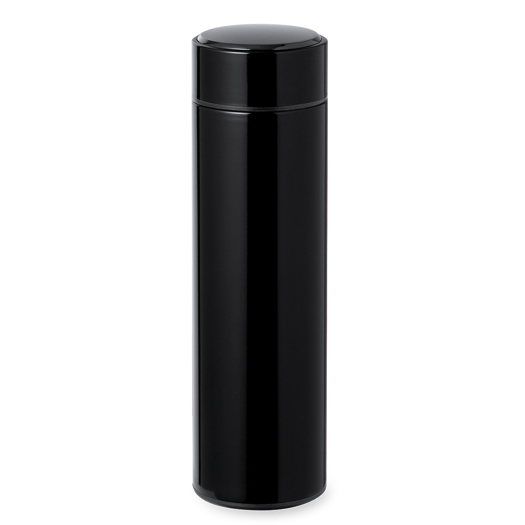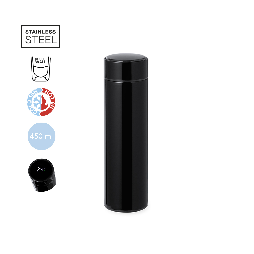 Termo en alta calidad de doble pared y 450 ml de capacidad, con medidor de temperatura táctil integrado en tapón. Fabricado en acero inox, que ofrece una resistencia y durabilidad excepcionales. Tapón en acero inox con infusor integrado y libre de BPA. Alimentación a pilas (de botón incluida), con manual de instrucciones en español e inglés. Disponible en variada gama de colores y presentado en atractiva caja de diseño kraft.