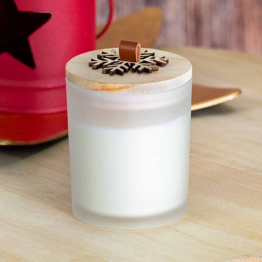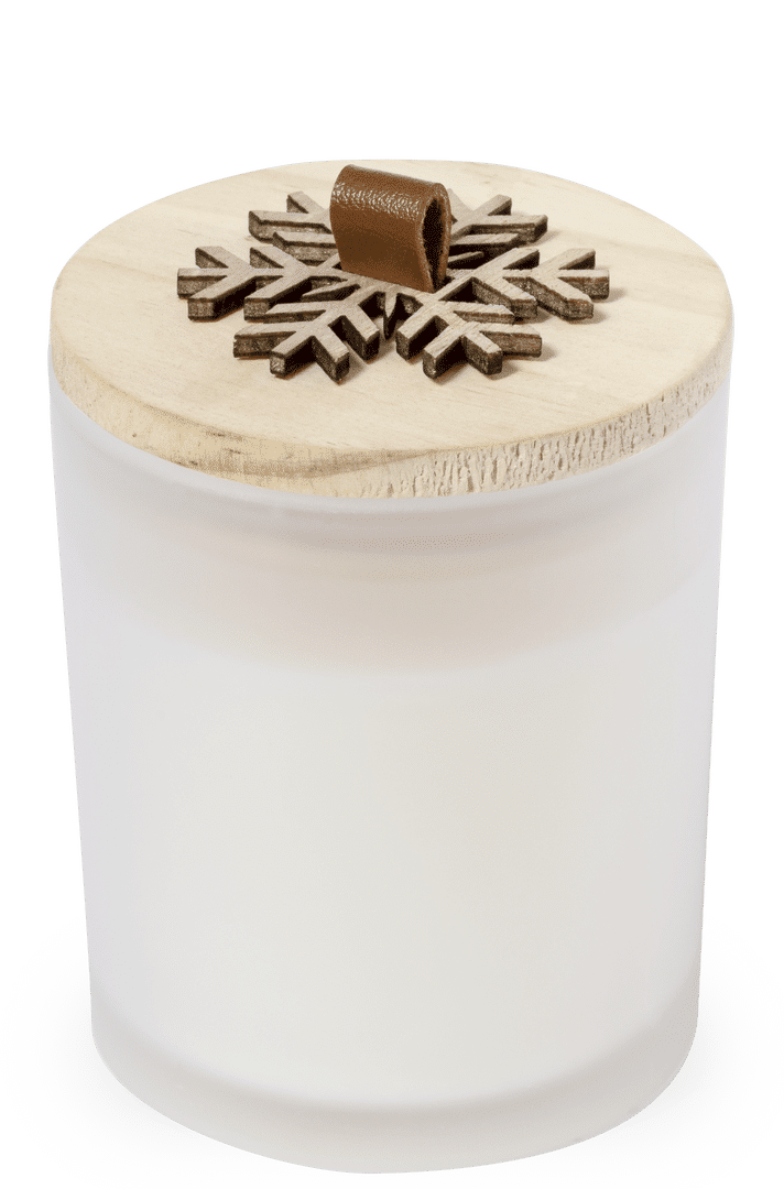 Vela de diseño navideño con aroma vainilla. Fabricada en cristal, con tapa de madera pulida y relieve diseñado en forma de copo de nieve. Presentada en atractiva caja individual kraft.