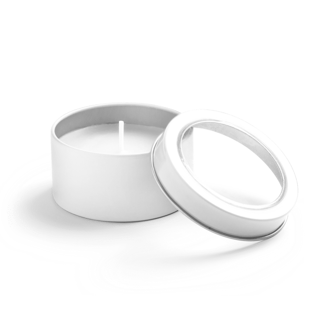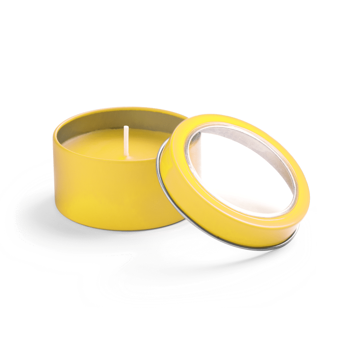 Vela aromática de fragancia vainilla presentada en original tarro metálico con ventana transparente en variada gama de vivos colores.